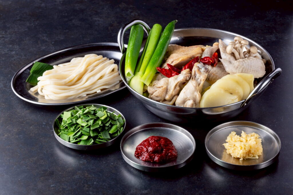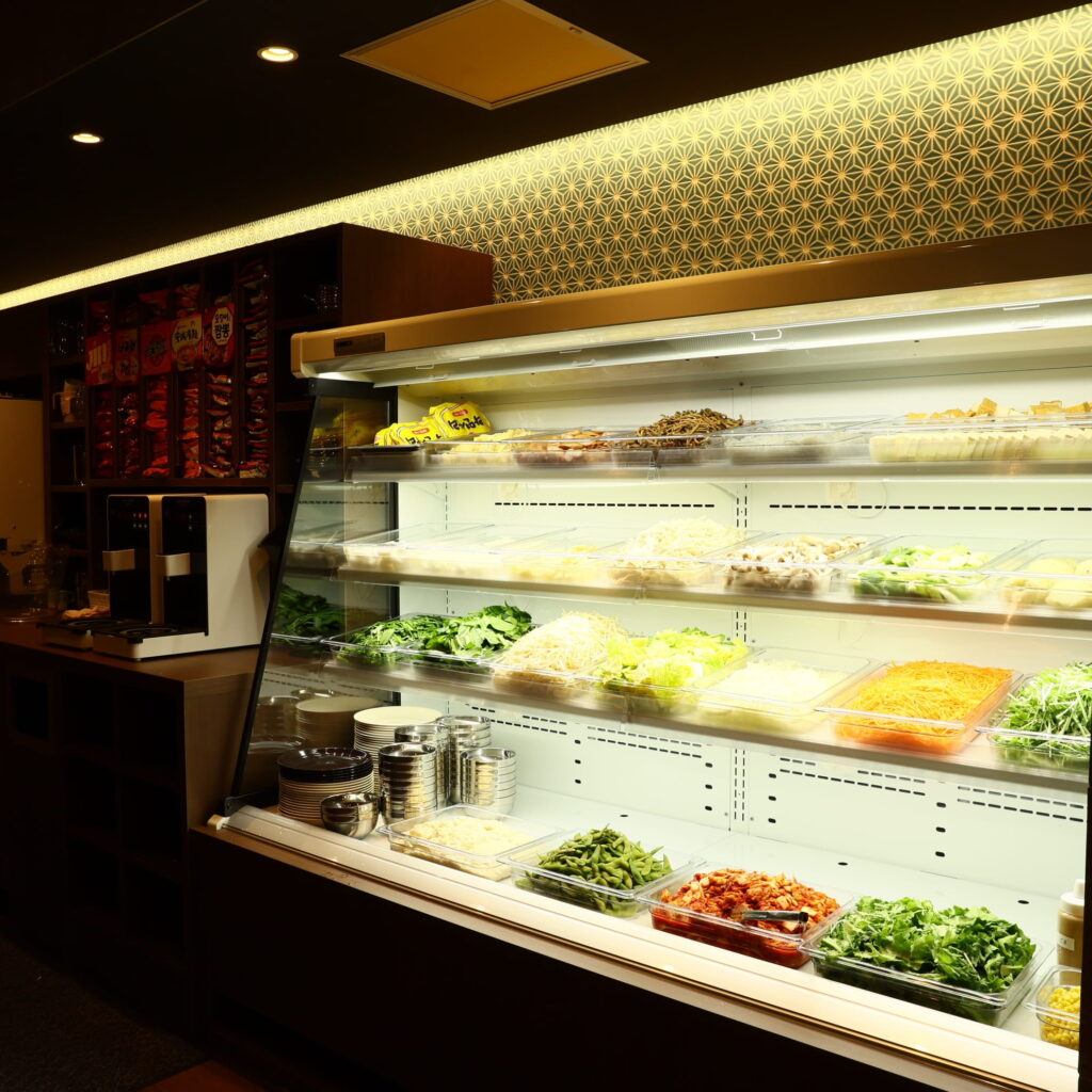 鍋の肉はコースごとに異なり、鶏肉・豚肉・骨付き豚肉などをオーダー制で提供。野菜や具材はガラスケースに並ぶ食材から自由に選べるセルフ方式で、韓国餅(トック)や韓国春雨(タンミョン)など、韓国らしい具材も豊富に用意されています。