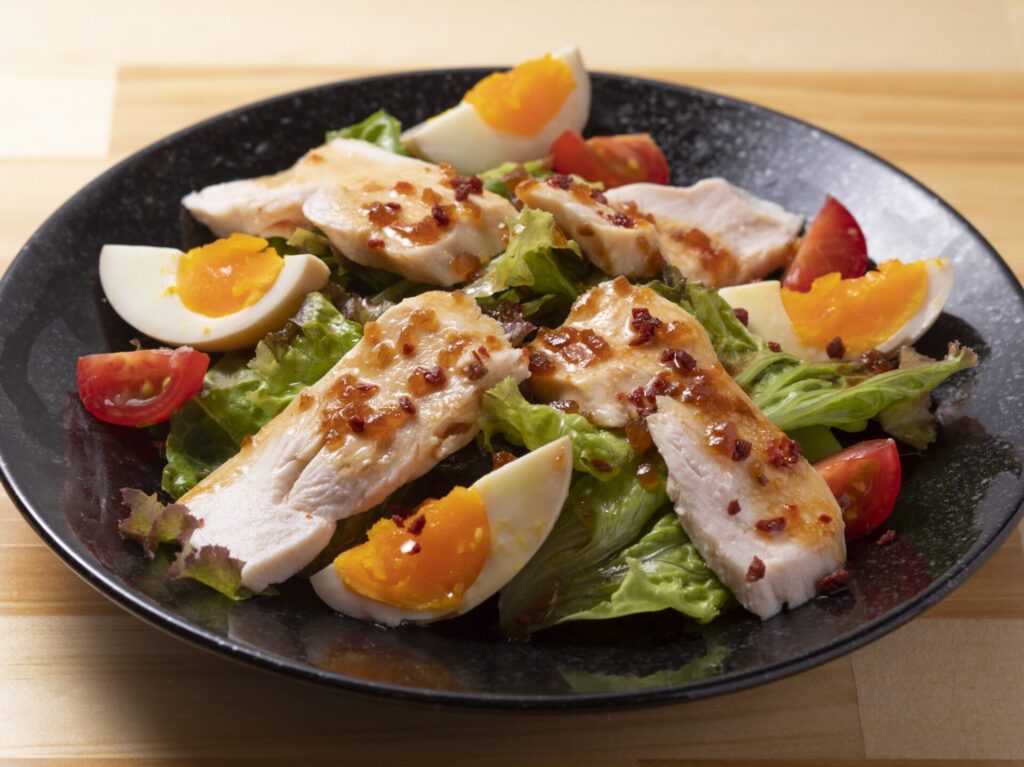 新鮮野菜に、しっとり柔らかなむね肉と味玉をトッピングした、ボリューム感のあるヘルシーサラダ。