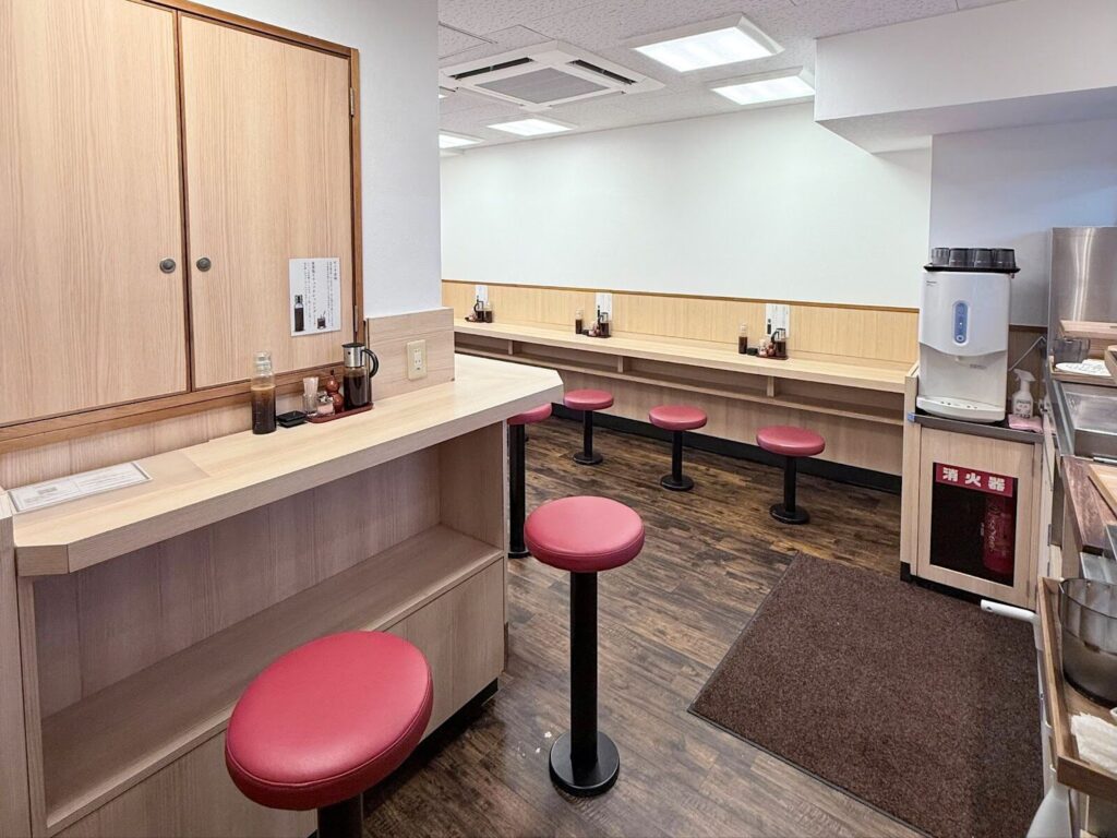 店内は木目調を基調とした温かみのあるデザインで、清潔感と居心地の良さを両立しています。赤い丸椅子が並ぶカウンター席は、どこか懐かしさを感じさせながらもモダンな雰囲気です。厨房からはカツが揚がる軽やかな音と香ばしい香りが広がり、五感で食欲を刺激します。