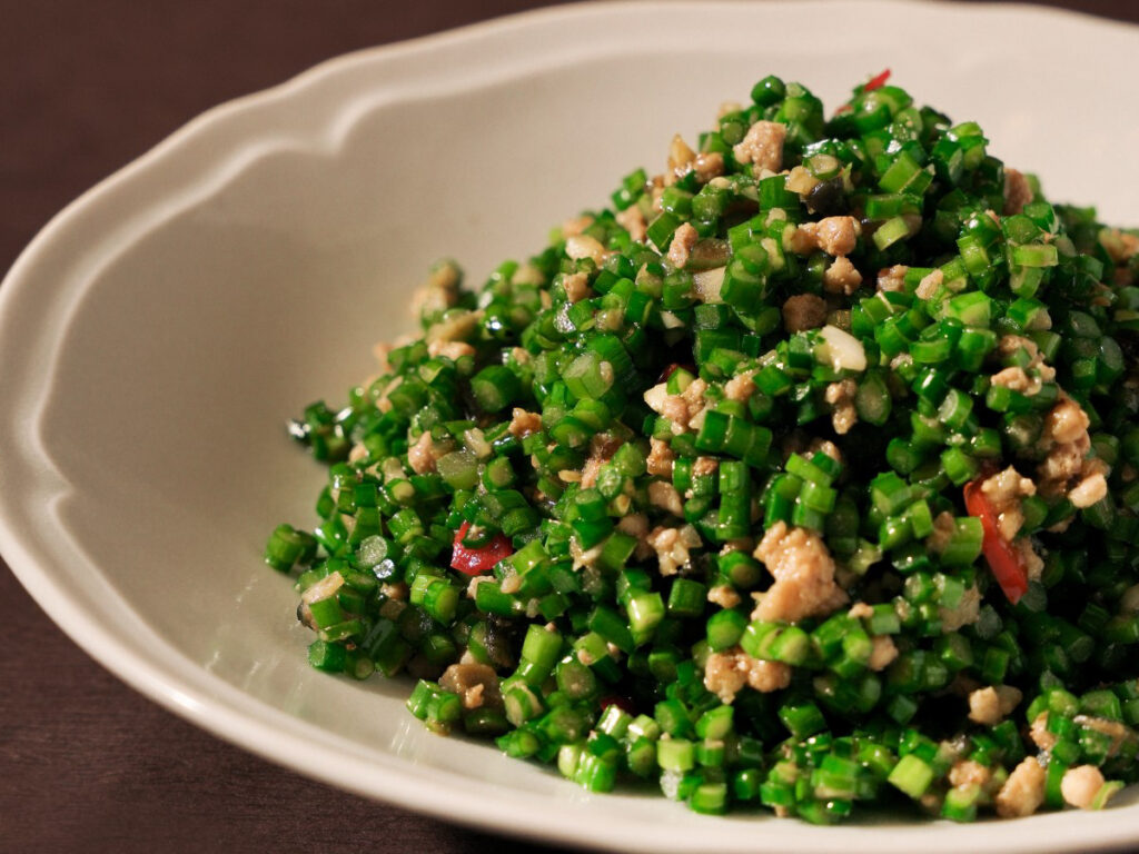 花ニラとピータン豚挽肉のピリ辛炒め