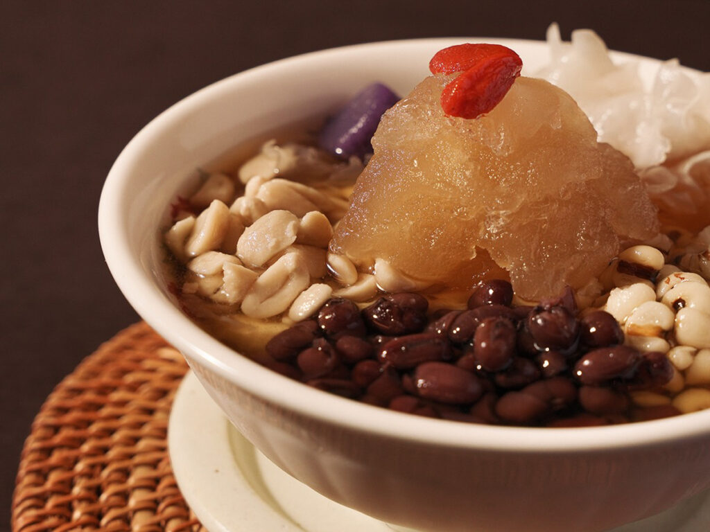 花生(ピーナッツ)やハトムギ、白キクラゲ、ナツメなどの薬膳食材に加え、芋圓(だんご)やフルーツなど多彩なラインナップを用意。その日の気分や体調に合わせてカスタマイズできる点が特徴です。