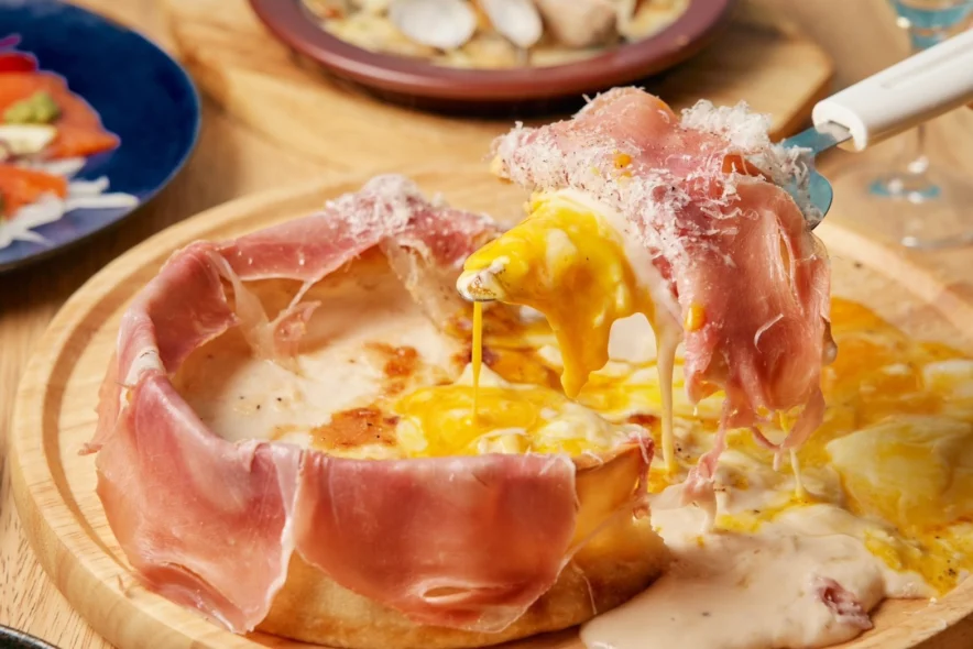 まず外せないのが、看板メニューの「生ハム温玉シカゴピザ」。ナイフを入れた瞬間、とろりと溢れ出すチーズの海。