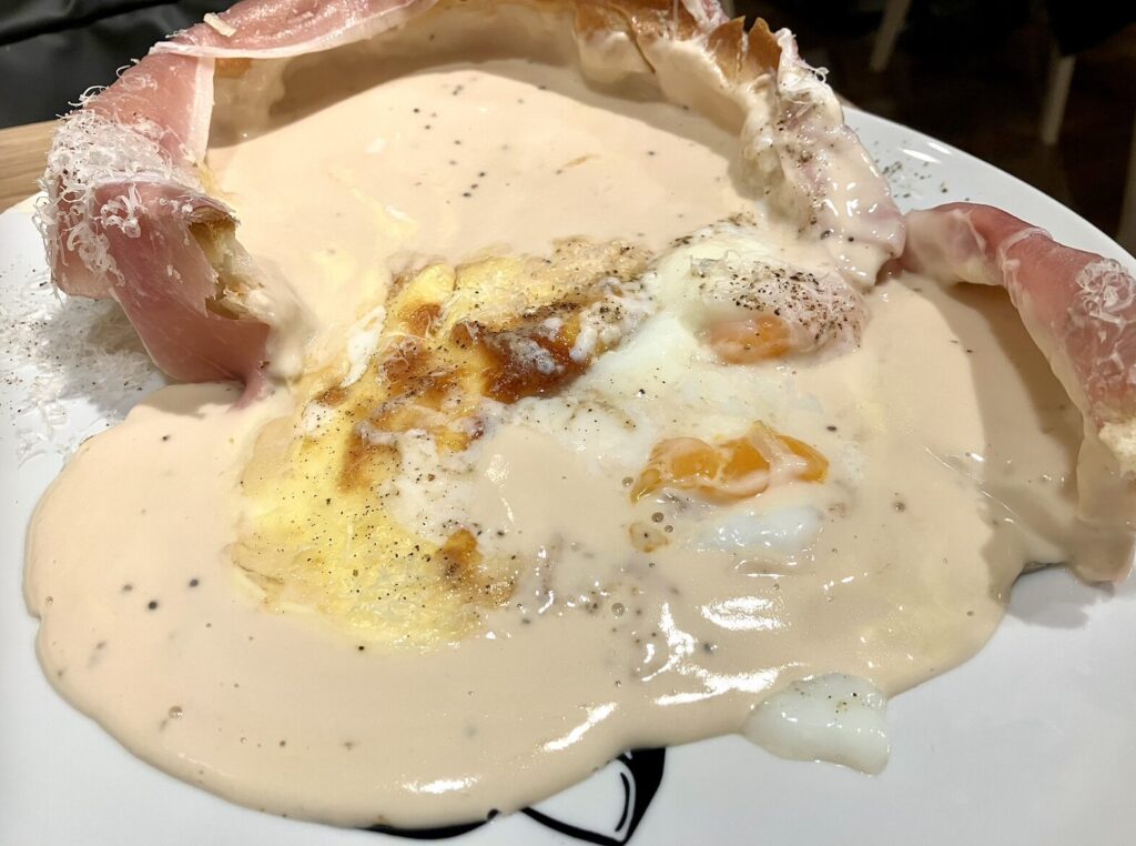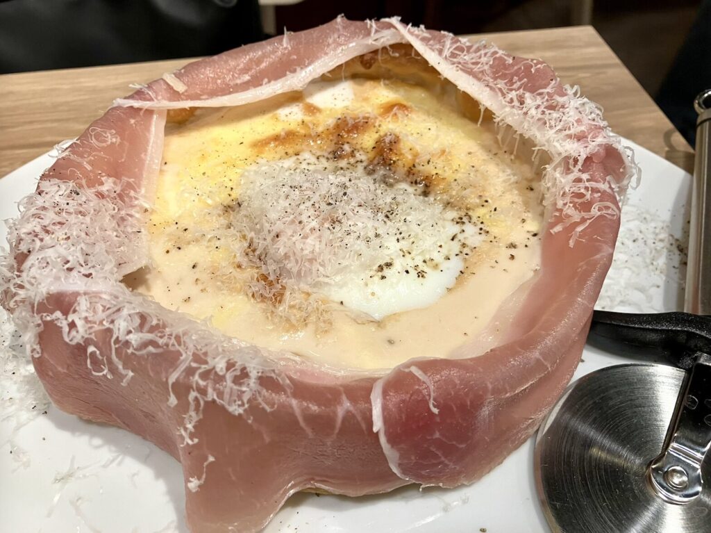 そこに温玉のコクと生ハムの塩味が重なり、濃厚ながらもバランスの取れた一皿です。視覚・香り・味覚すべてで楽しめる、まさに“主役級メニュー”。