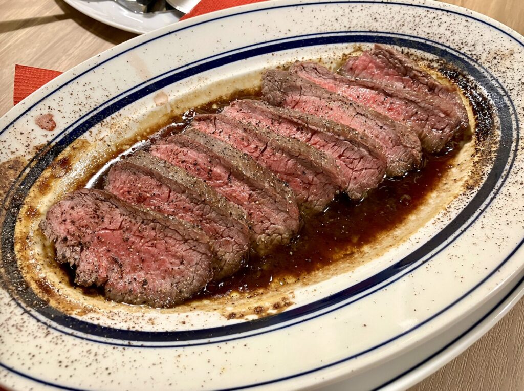 「厳選牛赤身のステーキ 赤ワインソース」は、ジューシーな肉の旨みと赤ワインのコクが重なり、チーズ料理との相性も抜群です。