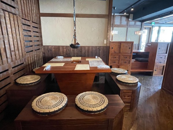 店内には、八丈島の暮らしに寄り添うような民藝家具が揃えられ、素朴であたたかみのある空間が広がります。テーブルや八丈タンスなども、店舗の雰囲気に合わせて特注をしたこだわりの品々です。店内の照明もあえて暗めに抑え、落ち着きのある空間を演出しています。他店舗とは異なる静かな灯りのなか、どこか懐かしく、心が和む雰囲気が漂います。