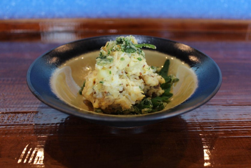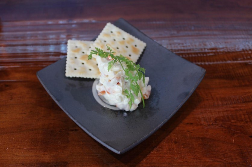 独特の風味を持つ「くさや」と明日葉を、まろやかなマヨネーズと合わせることでクセを和らげ、食べやすく仕上げた一皿です。