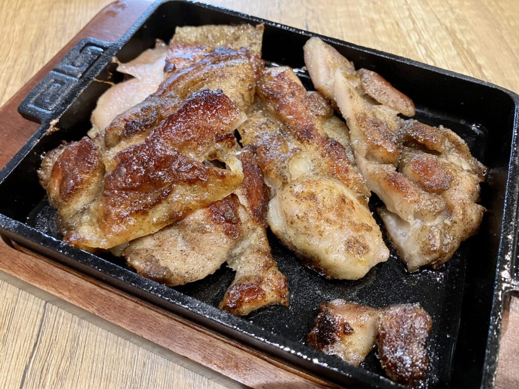 熱々の鉄板で提供される鶏もも肉は、ジューシーで食べ応え抜群。魚が苦手な人がいても安心できる一皿です。