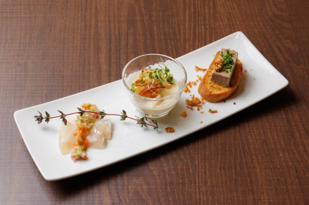 - 前菜三種盛り合わせ ~黒毛和牛のコンフィ、桜鯛のカルパッチョ、新玉葱のブランマンジェ~