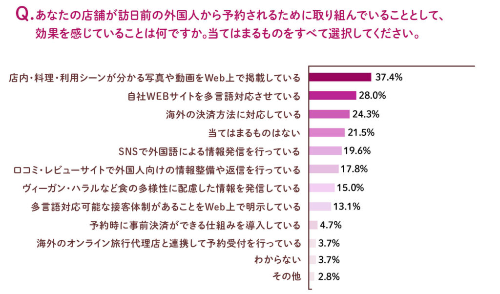 「旅マエ予約」による来店頻度が1ヶ月に1回より多い飲食店について、訪日観光客の集客に効果的な施策を聞いたところ、第1位は「店内・料理・利用シーンが分かる写真や動画をWeb上で掲載している(37.4%)」でした。次いで「自社WEBサイトを多言語対応させている(28.0%)」や「海外の決済方法に対応している(24.3%)」、さらに「ヴィーガン・ハラルなど食の多様性に配慮した情報を発信している(15.0%)」が続いており、訪日観光客が抱く「自分の母国語や決済手段が使えるか」「自分の食事制限に対応しているか」という不安を事前に解消することが、「旅マエ」の段階で予約される決め手になっていると考えられます。