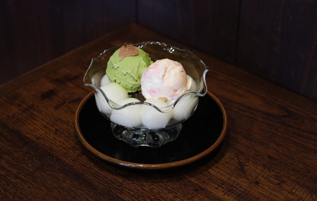 もちもちの白玉、ふんわり桜風味のアイスクリームとあずき餡がそれぞれ重なり合い、まるで桜餅のような贅沢な味わいをお楽しみいただける一品です。