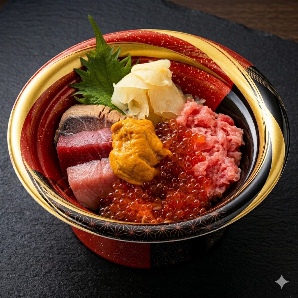 ※丼は〆茶漬け用お出汁と薬味(胡麻、のり、わさび)付き