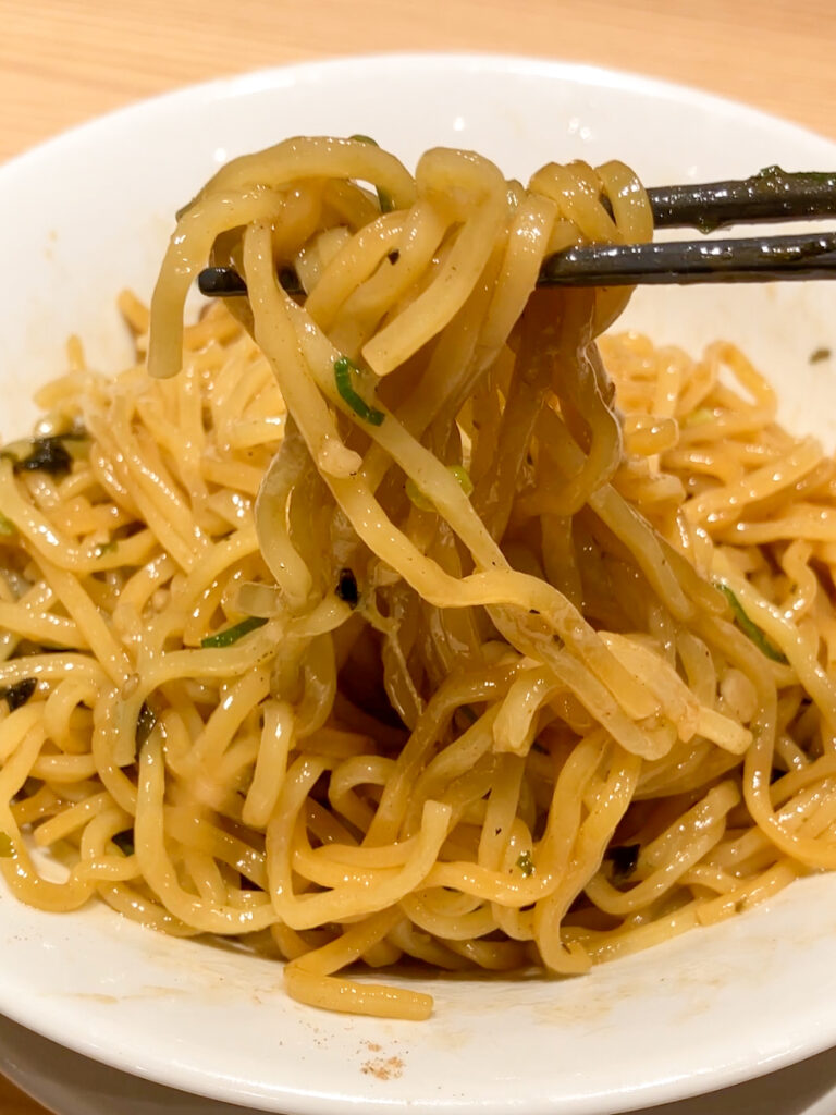 今回試食した「熟成醤油 油そば」は、ひと口目からインパクト抜群。もちもちの中太麺に、丸源ラーメン自慢の熟成醤油ダレとコク深い油がしっかり絡みます。