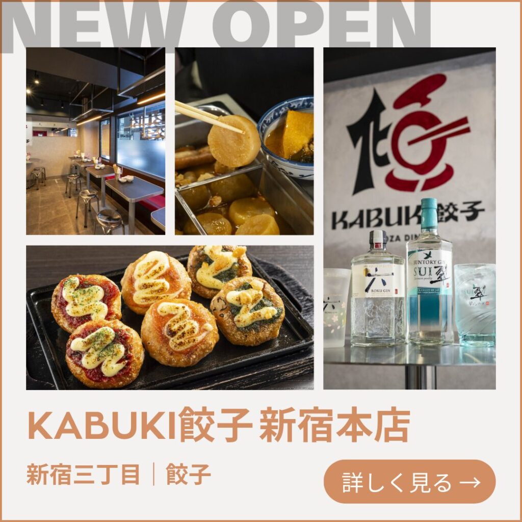 「食と文化で、人と夢がつながる舞台」を掲げ、多彩な餃子と台湾おでんを楽しめる新感覚のダイニング。看板のKABUKI餃子は肉汁と香りが際立ち、創作トッピングで味の広がりも抜群。ピリ辛な味わいが特徴的な台湾おでんとともに翠ジンと合わせれば、新宿で心躍る食体験が生まれます。