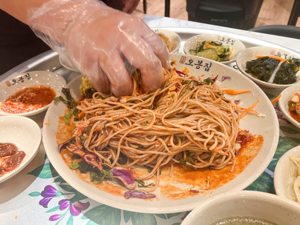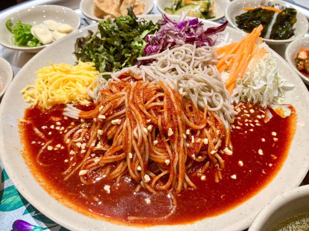 彩り豊かな野菜とコシのある麺を、甘酸っぱい特製ソースで混ぜ合わせて楽しむ“韓国版まぜそば”。