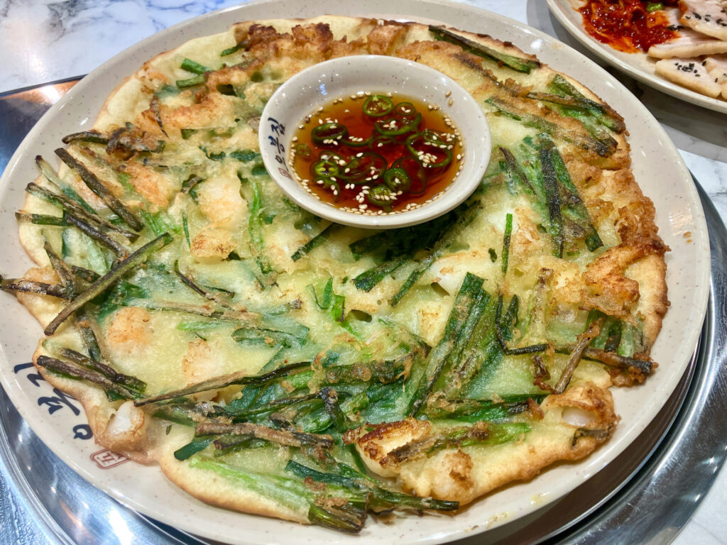 エビやイカ、ニラなど具材たっぷり。外はカリッと香ばしく、中はモチモチ。