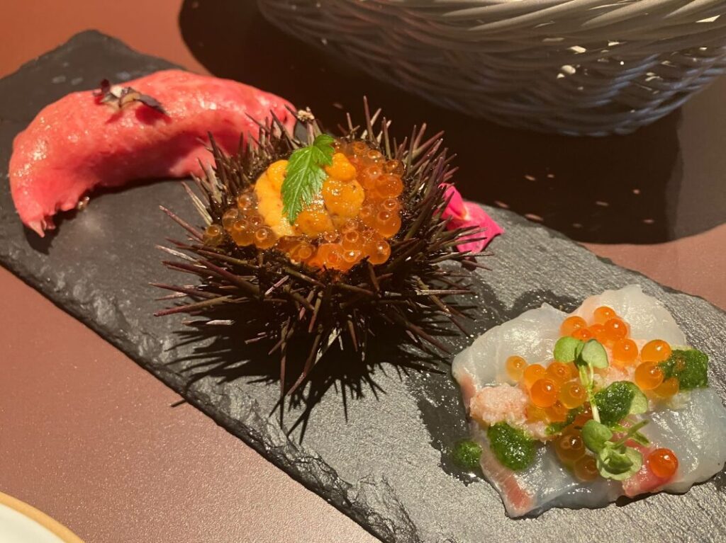 前菜盛り合わせ(肉寿司・ウニク・真鯛のカルパッチョ)、サラダ、オニオングラタンスープ、牛すじ塩煮込み、ステーキ、デザートという豪華構成に加え、『俺のBakery』特製のパンが2種食べ放題で楽しめます。(コース詳細は店舖公式ページをご確認ください)