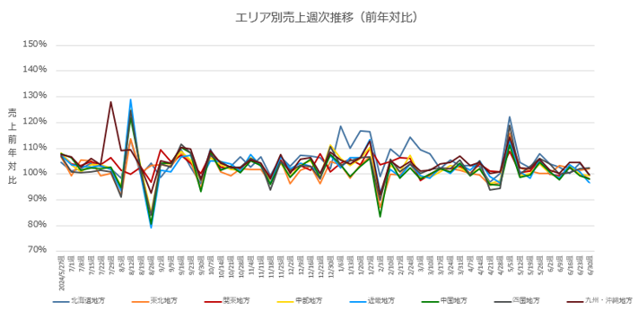 6月売上、前年対比の伸長率(地方平均)は100.9%と前月から4.0pt減少した。 その中でも、地域別で最も高いのは北海道地方で、前年対比102.1%となった。