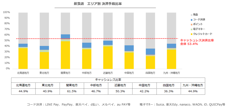 - 業態別にキャッシュレス比率を見ると、すべての業態で35%を超える。またコード決済比率が一番高い「持ち帰り」では、その割合が15.2%であった。