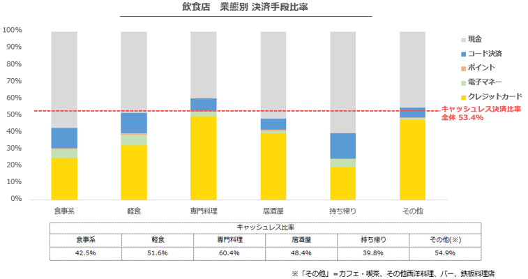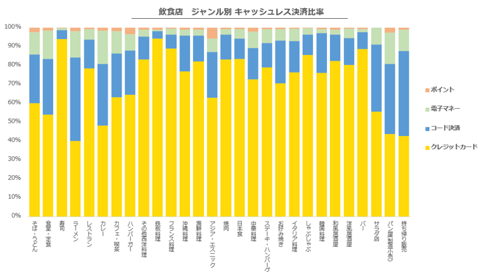 また、コード決済比率が一番高い持ち帰りでは、その割合が15.2%となる。 - ジャンル別に見ると、28ジャンル中19ジャンルでキャッシュレス比率が50%を超える。