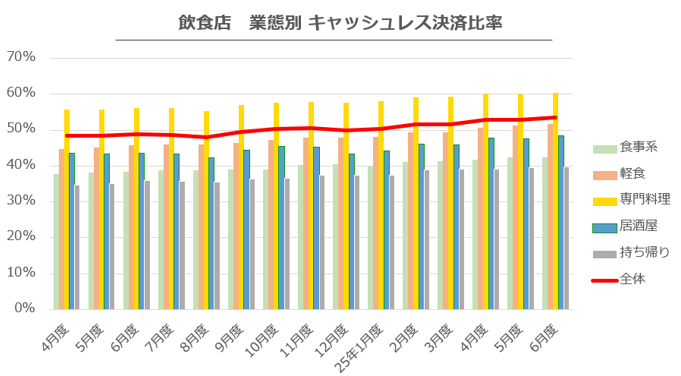 業態別で見ると、キャッシュレス決済利用が最も多いのは専門料理で、前月から0.1pt増加し、49.9%となった。