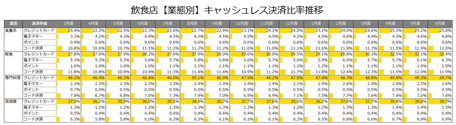 キャッシュレス決済比率は5月度から6月度にかけて、すべての業態で増加した