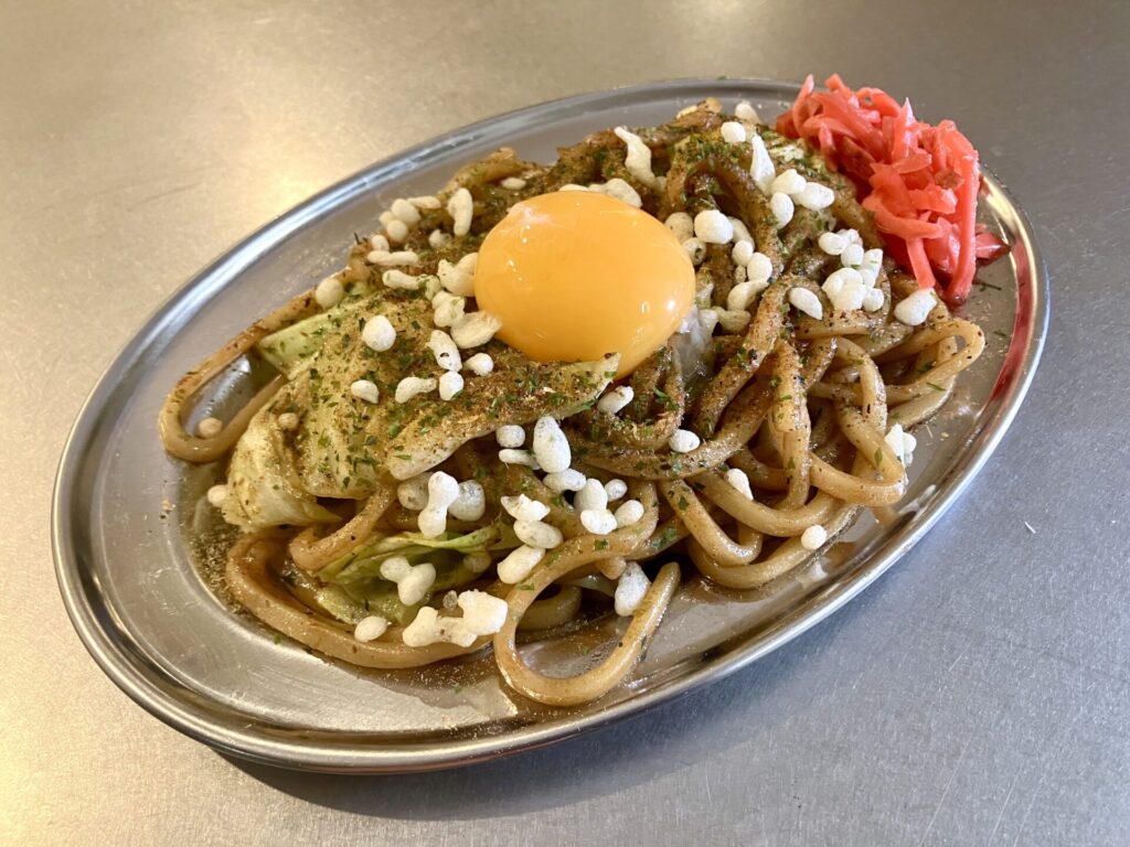 締めには、太麺×濃厚ソース×卵黄が絡む「月見焼きそば」もおすすめです。