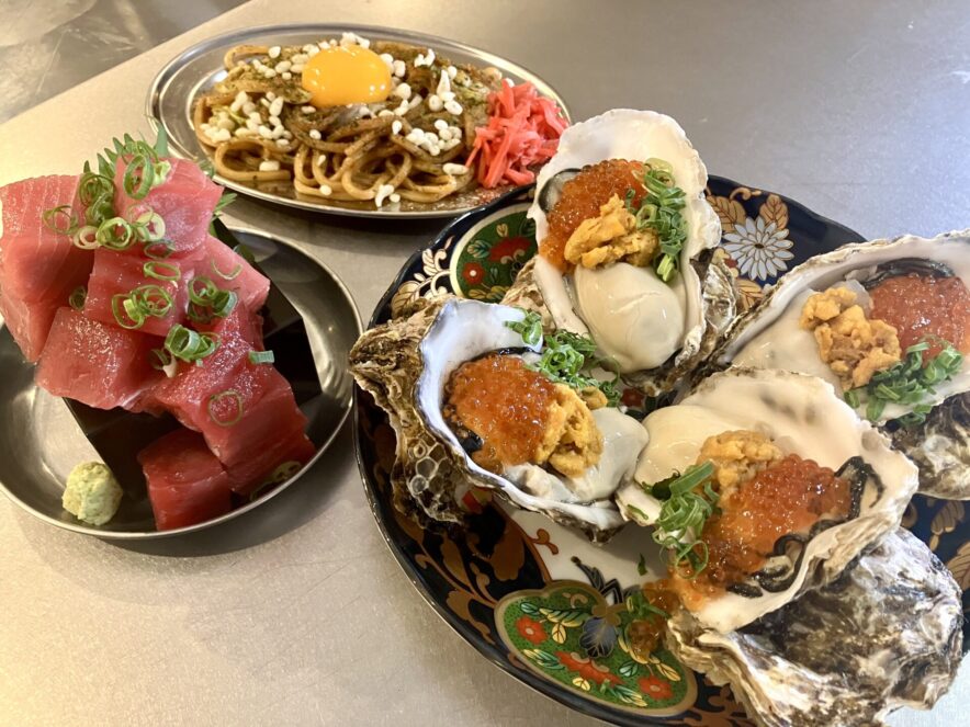 名物は“痛風生カキ”と豪快なまぐろ料理