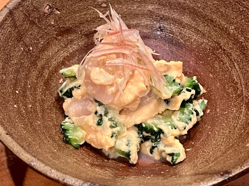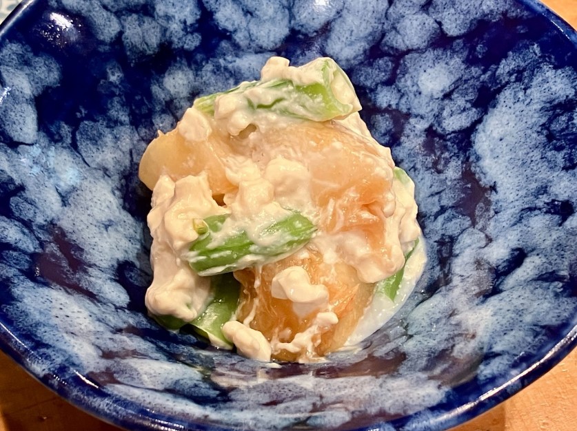 「びわとスナップエンドウの白和え」は、初夏ならではの爽やかな甘さとシャキッとした食感が魅力。優しい白和えが全体を包み込み、ふわりとした後味を演出します。