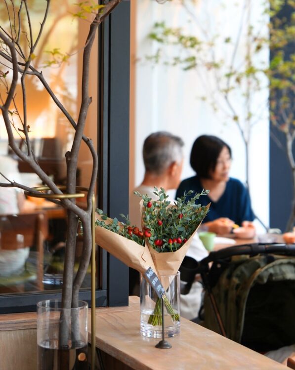 SiKiTO CAFEのコンセプトは「四季のうつろいを、愛おしむカフェ」です。店内には、季節に合った切り枝が飾られ、訪れるたびに新たな季節を感じられるように工夫されています。春には桜、秋には紅葉、冬には雪景色を思わせる枝ものが飾られ、季節感を存分に楽しめます。それぞれの時間をほっと過ごせる“庭”のような存在のカフェです。