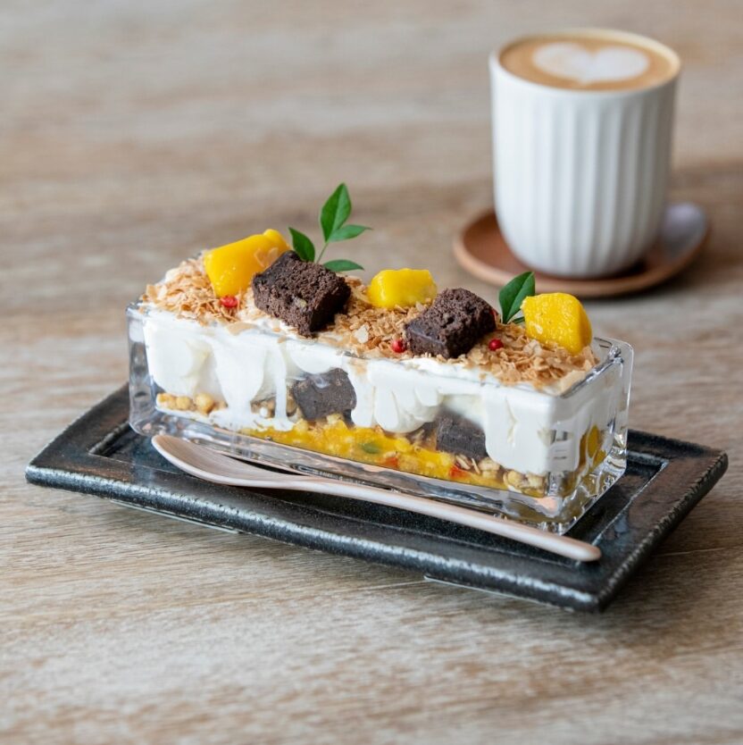 季節のグラスパフェは、見た目にも美しく、季節ごとに異なるフルーツや素材が使われ、訪れるたびに新しい驚きがあります。盛り付けをしているグラスは、お花を飾ることができるものを使用。カフェの雰囲気に合わせて、食べる前から楽しめるビジュアルが広がります。