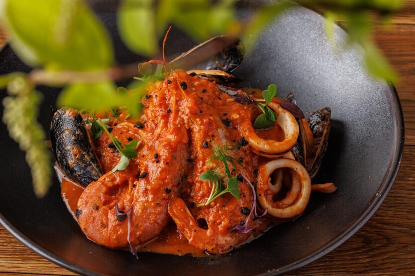 季節のパスタは、生パスタを使用した四季で内容が変わるパスタです。夏のメニューは「赤海老とムール貝のペスカトーレ」。まるごと2尾の新鮮な赤海老がのった贅沢な海鮮パスタです。海老は生でも食べられるほど新鮮で、そのぷりっとした食感と自然な甘みが絶品です。海老の甘みがトマトソースと見事に絡まり、魚介の旨みを存分に楽しめます。