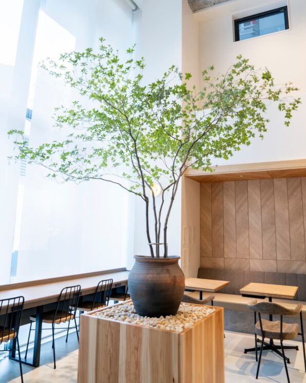店内では、季節ごとに変わる切り枝が飾られ、訪れるたびにその変化を感じられます。さらに、日本在住のフランス人アーティストに依頼した、オリジナルのアート作品も展示されています。アートと自然が調和した空間で、より一層の魅力を感じることができます。