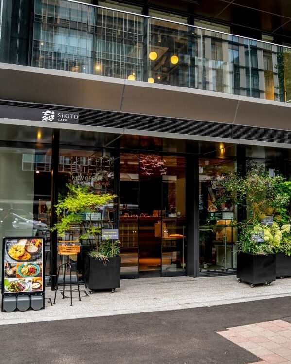 SiKiTO CAFE 日本橋店の外観には、季節感のある植栽が施されており、訪れる人々が四季の変化を感じられるのが魅力です。お店の前を通るたびに、季節ごとに異なる植物の表情を楽しむことができ、自然と調和した雰囲気が広がっています。