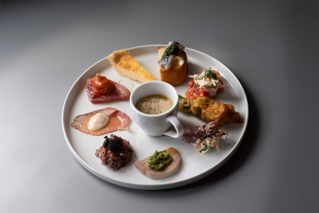 また「前菜盛り合わせ」では、「馬肉とトリュフのタルタル」や「仔牛のハムとツナソース」など、郷土色豊かなアンティパストを少しずつ盛り込み、彩り豊かに仕立てています。