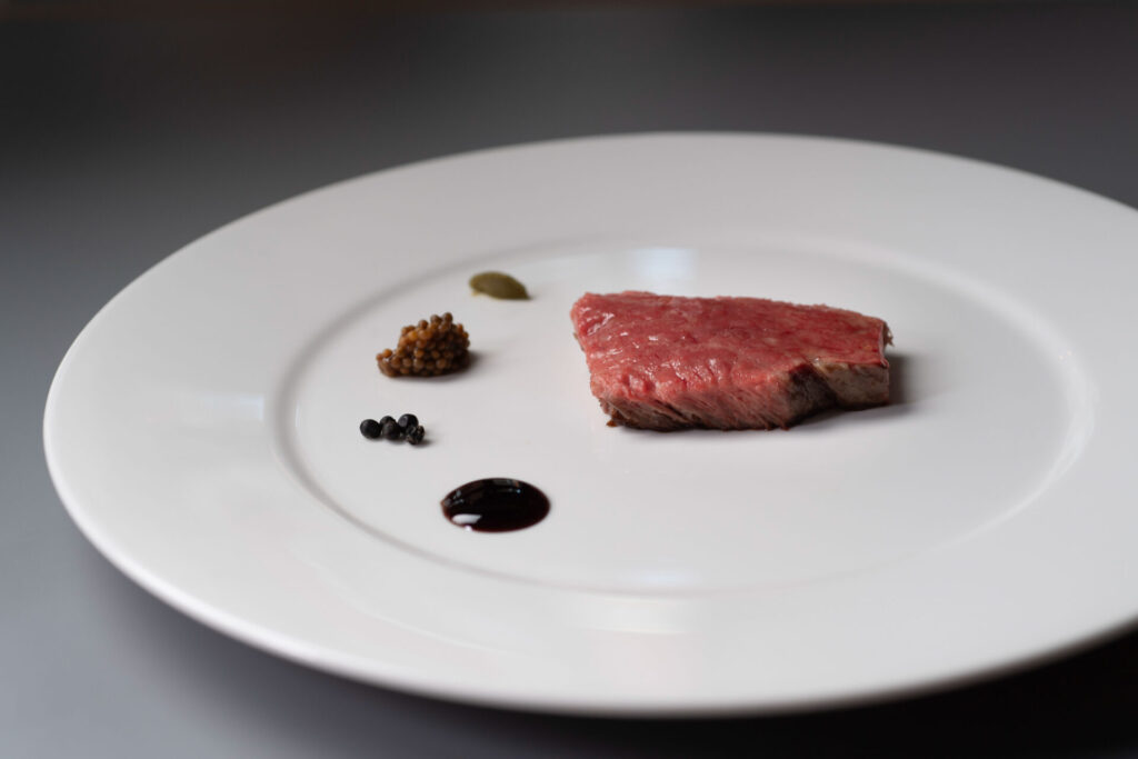 群馬県産ブランド牛「上州牛」のサーロインを炭火で香ばしく焼き上げた一皿。表面はクリスピーに、中はジューシーに仕上げることで、香ばしさと上質な脂の甘みのコントラストを楽しめます。