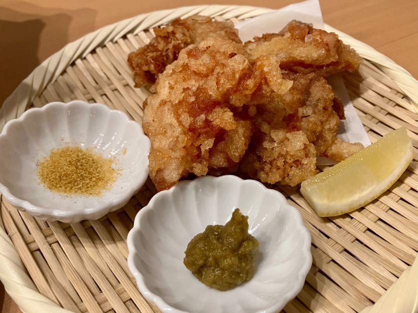 「蕎麦屋のから揚げ」は、蕎麦の出汁で漬け込み、衣はカリッと、中はジューシー。柚子胡椒やカレー塩との相性も抜群で、お酒との相性も申し分なし。