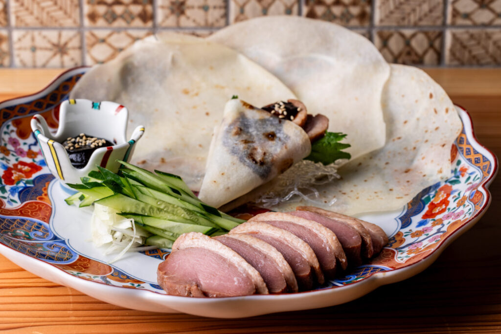 鴨肉を香ばしく焼き上げ、北京ダック風に仕立てた一品。甘辛いタレとともに包んで楽しむ、食べ応えのある味わいです。