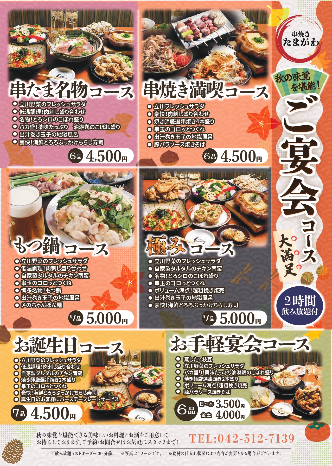 串焼き たまがわは既存の人気コースに加え、『お誕生日コース』が登場。また、串たま秋冬の人気コース『もつ鍋コース』もラインナップ。