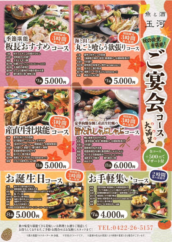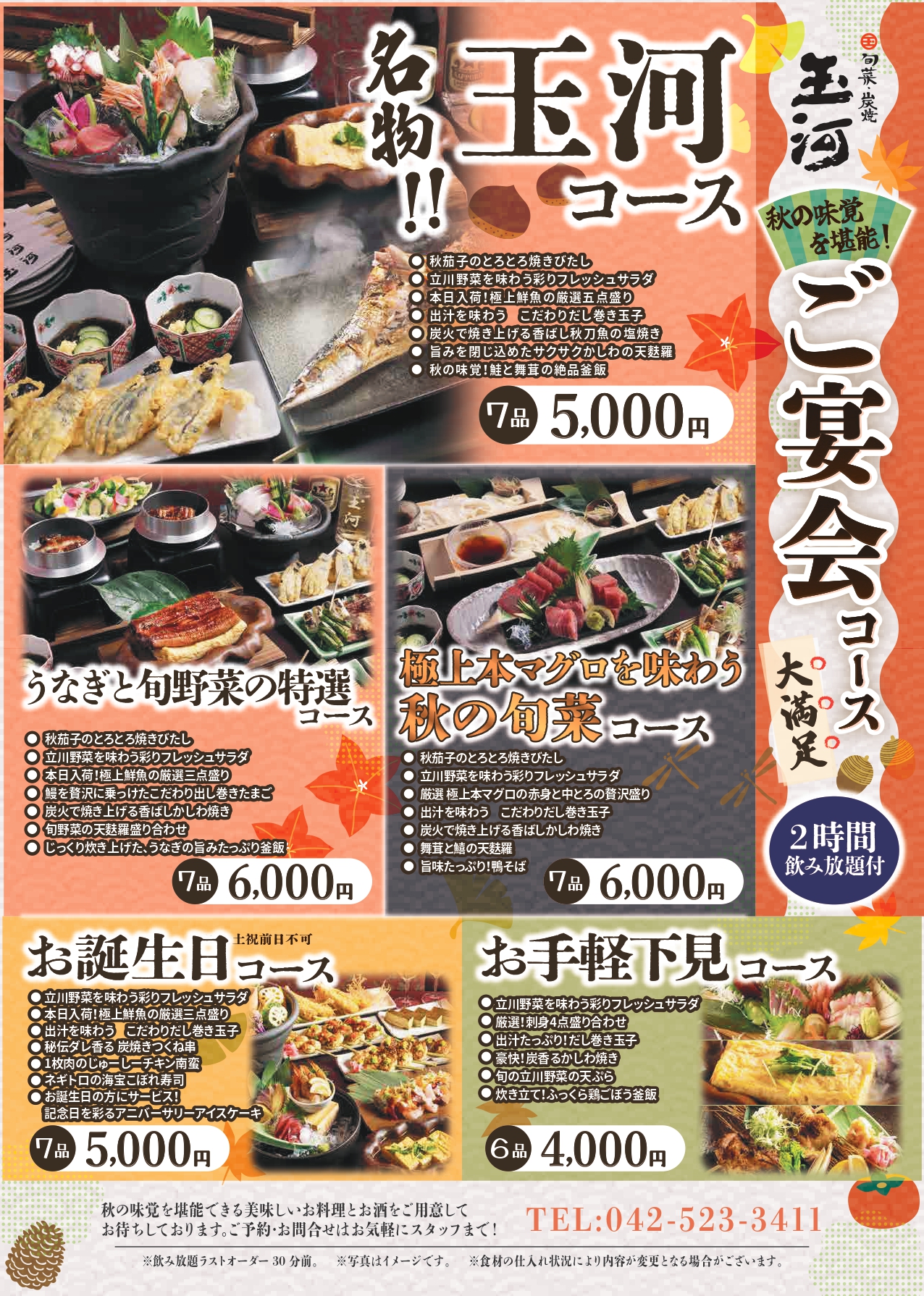 旬菜炭焼 玉河の秋の新コースは5つ。玉河ならではのお刺身や名物料理をお楽しみいただける各種コースは、ご予算やお好みに応じてお選びいただけます。