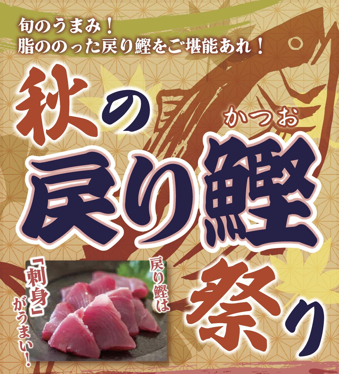 玉河4店舗で10月1日から開催の『秋の戻り鰹祭り』。