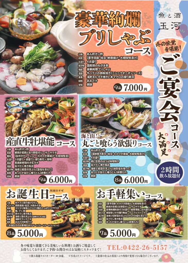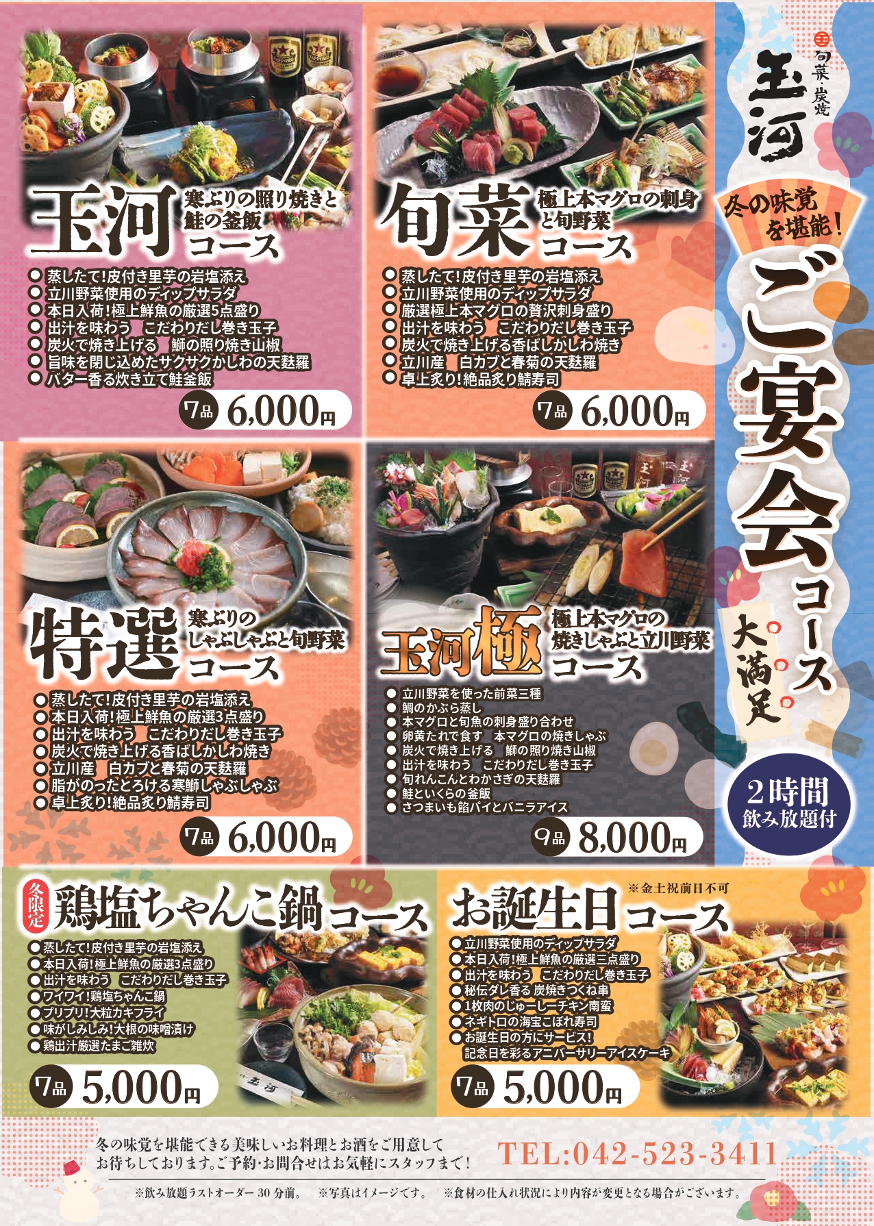 この冬限定の特別メニューを取り揃えた宴会コースは、一年を締めくくる忘年会などのお集りに最適です。身も心もあたたまる、癒しのひと時を玉河でお過ごしください。