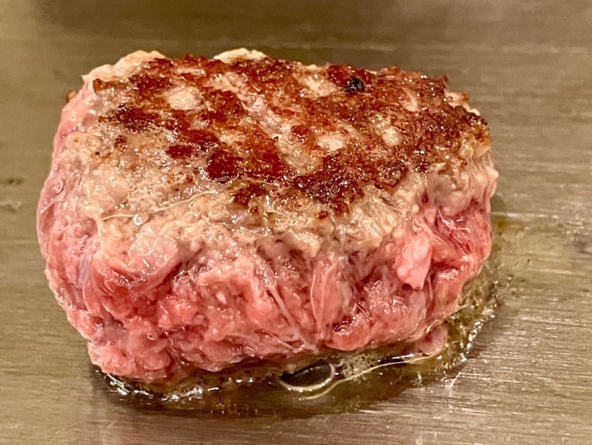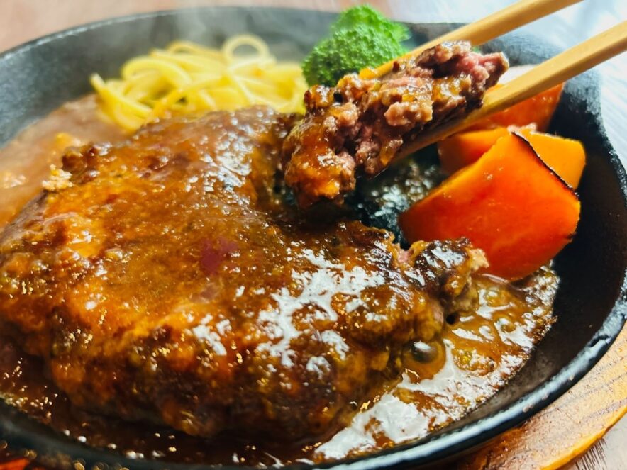 ランチは、つなぎを一切使わずに仕上げた熟成牛100%のハンバーグ専門店として営業。熟成期間5日間。旨味が凝縮された赤身肉をミディアムレアに焼き上げた、とろけるような食感のハンバーグ。