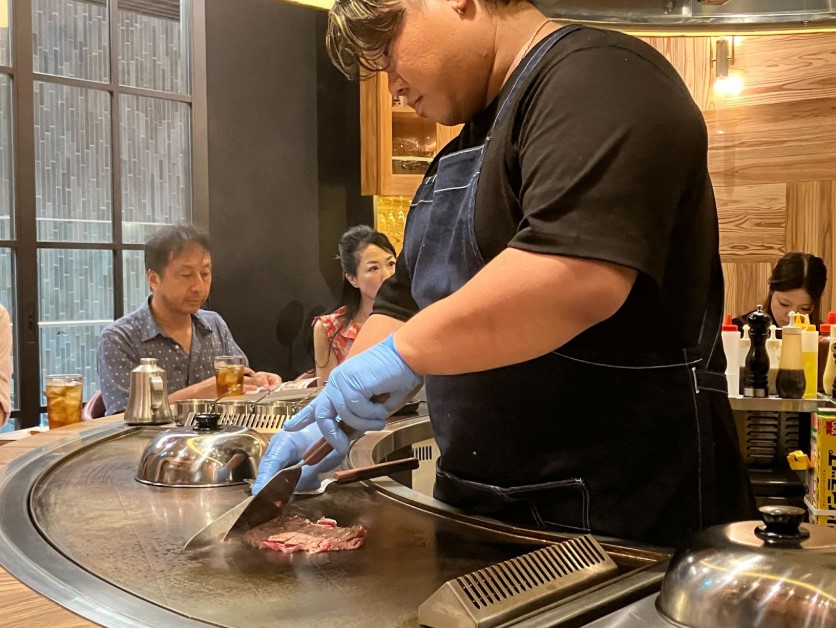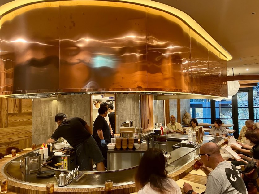 空間設計は、高級鉄板焼き店のような落ち着いたムードと、居酒屋の親しみやすさを両立。