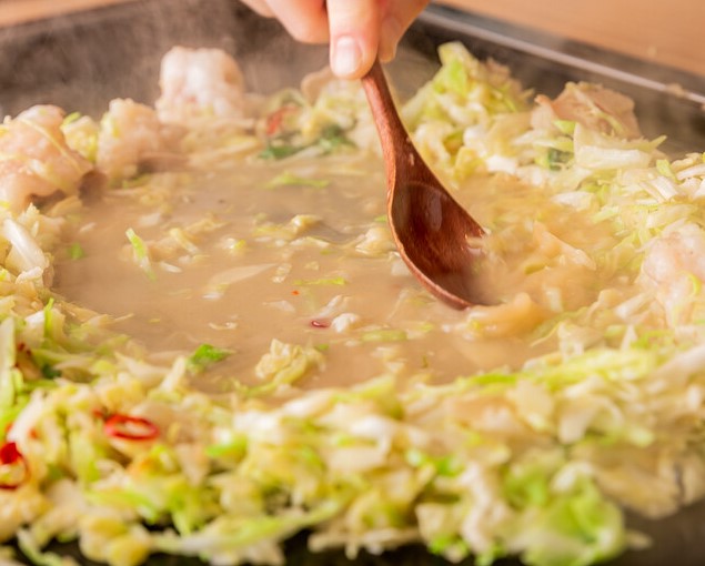 もんじゃ焼きもお好み焼きも、店側が焼くスタイル。一番おいしい状態で食べてもらいたいという想いから、スタッフが調理して提供しています。焼いている最中にはもんじゃ焼きの説明やこだわりについてお話しするので、退屈せずに楽しんでもらえると思います。