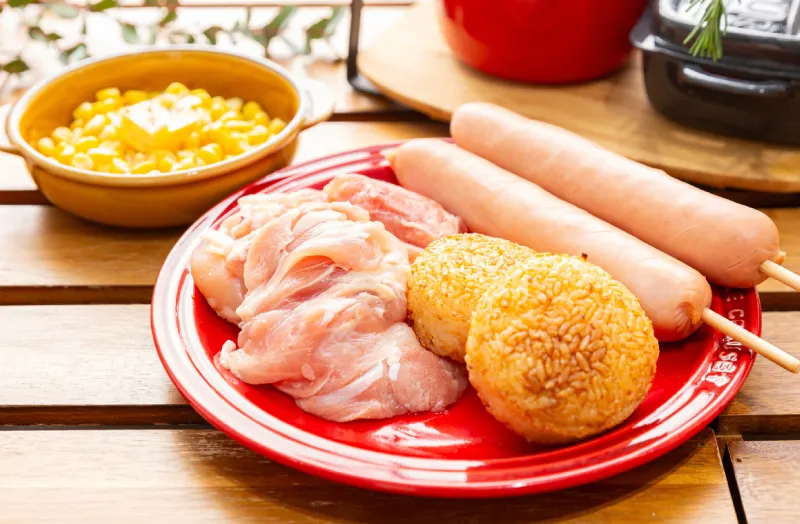 鶏ステーキ、コーンバター、フランクフルト、焼きおにぎり