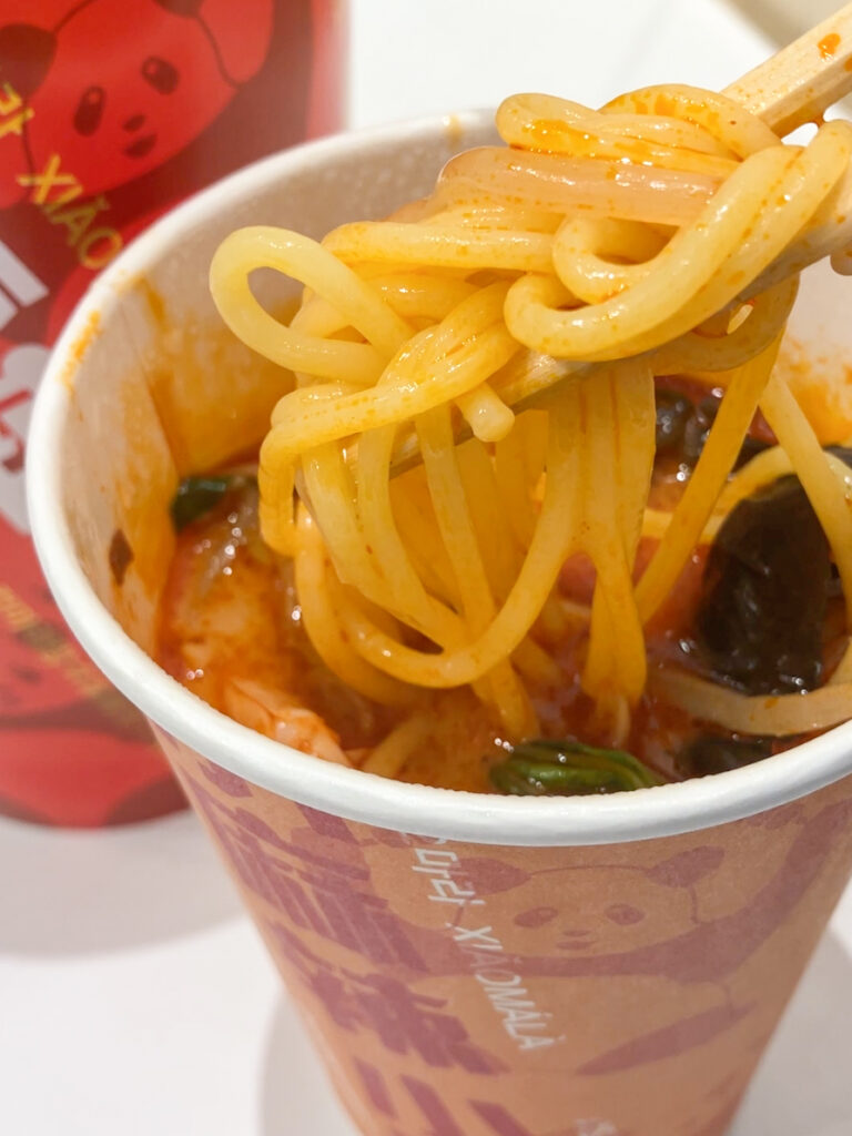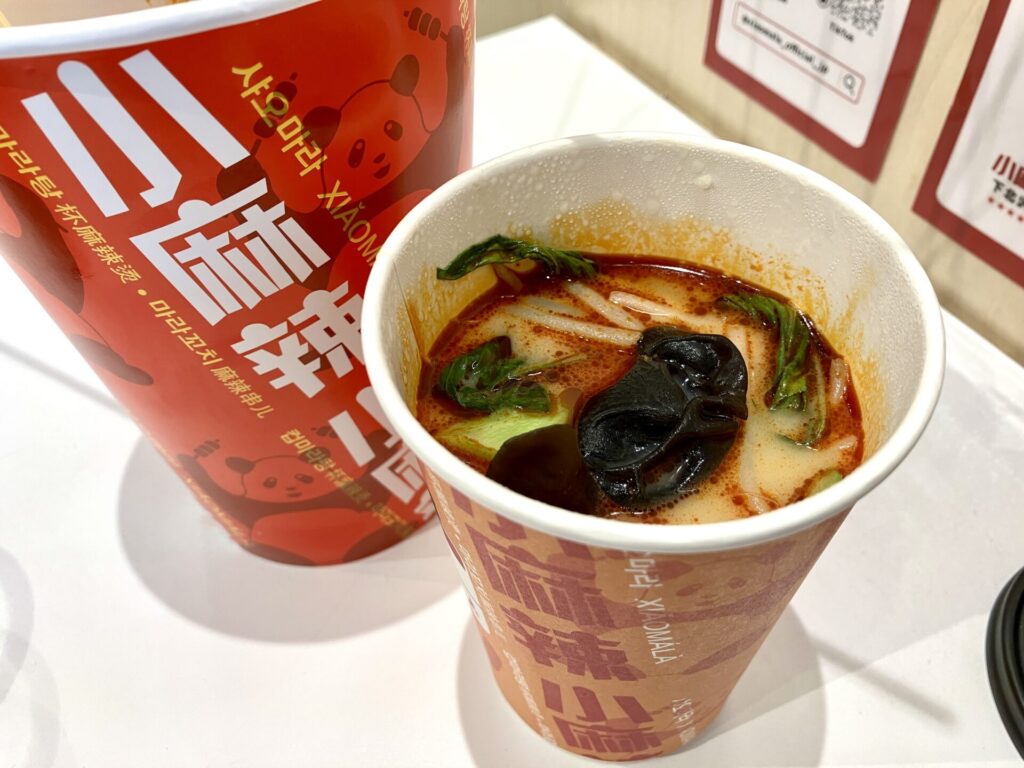 従来のように丼で提供されるスタイルではなく、カップに凝縮された麻辣スープは、食べ歩きやテイクアウトに最適。