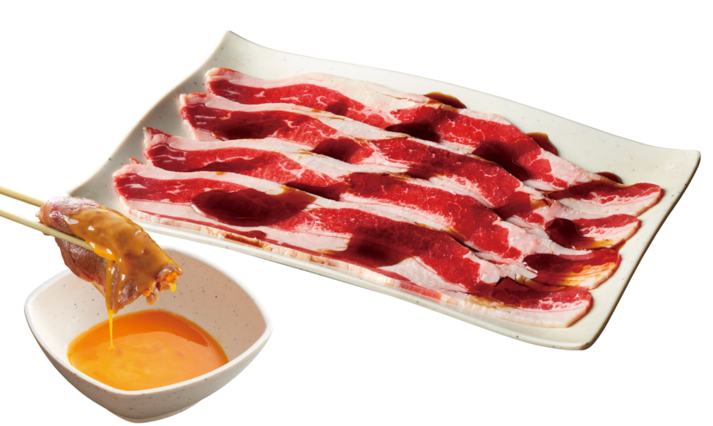 すき焼き風の味付けと炭火の香ばしさを楽しめるメニュー。醤油ベースの特製ダレが約2.1ミリの厚みのカルビに染み込んでいて、単体でも濃厚な味わいです。お好みで生卵をつけて、すき焼きのようにマイルドに食べるスタイルもおすすめ。