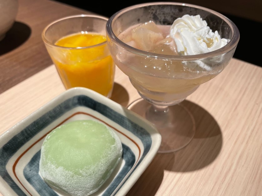 スイーツ好きな方には、フレッシュなフルーツを使った限定メニューがおすすめです。なかでも『すりおろし白桃ゼリー』は店員さんのイチオシで、濃厚な桃の味を存分に楽しめるデザート。ほかにも『クラウンメロン大福(果汁入り)』や『とろ~りマンゴーわらび餅』という今だけの特別デザートも要チェックです。